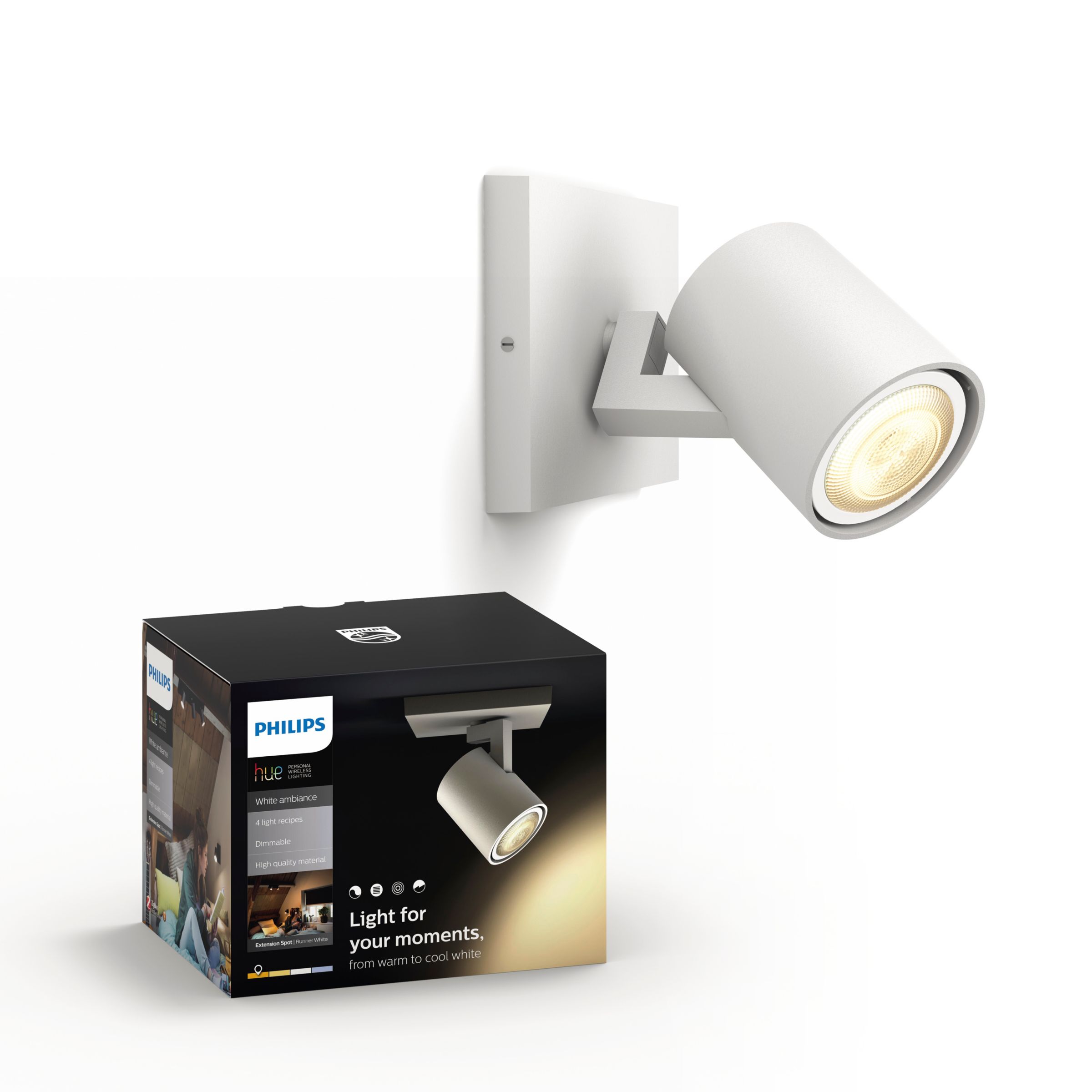 Rozšiřte svůj systém Philips Hue o další bílá bodová světla a užívejte si teplé až studené bílé světlo. Chcete-li ovládat světla pomocí chytrého zařízení, potřebujete můstek Philips Hue, který je dodáván v rámci startovní sady. Připojte bodové světlo k můstku a ovládejte ho podle potřeby.