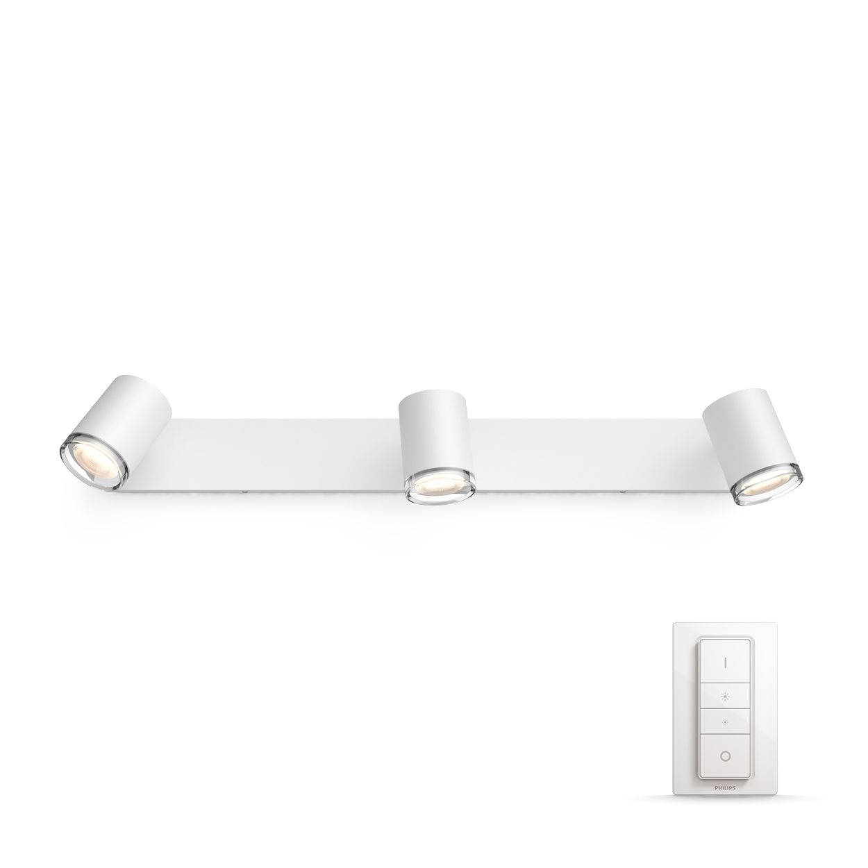 Med spotlyset Philips Hue White ambiance Adore kan du oplyse dit rum med tre lyskilder og tilpasse belysningen til formålet med belysningsløsningerne Få ny energi, Koncentrer dig, Læs og Slap af. Lyskilden kan nemt styres med det samme via Bluetooth eller ved hjælp af den medfølgende Hue Dimmer switch. Få adgang til flere intelligente belysningsfunktioner med en Hue Bridge.
