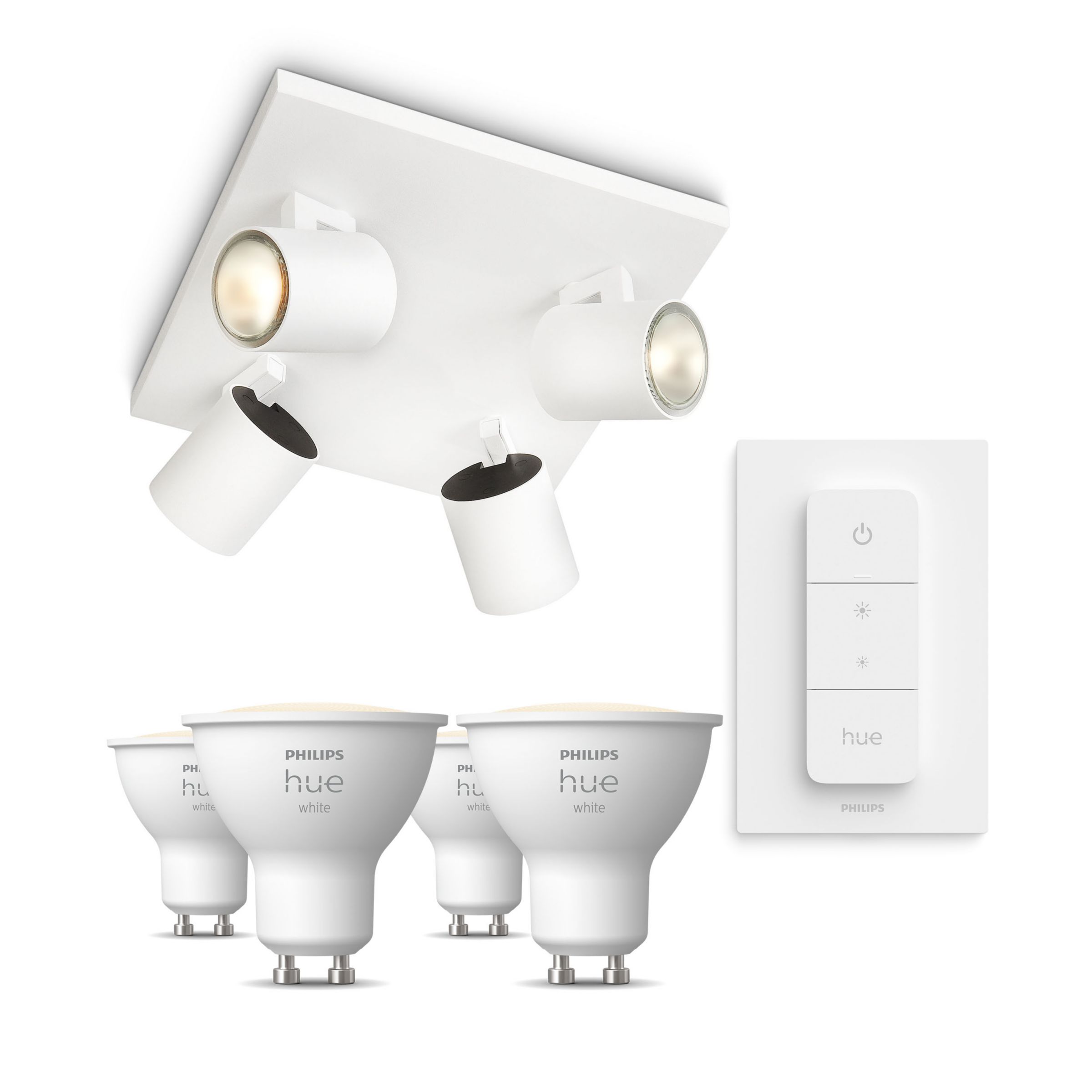 Få perfekt belysning med Philips Runner med 4 spots i hvid, inklusive en Hue Dimmer switch og intelligente Hue White GU10 spots. Elegant og alsidig.