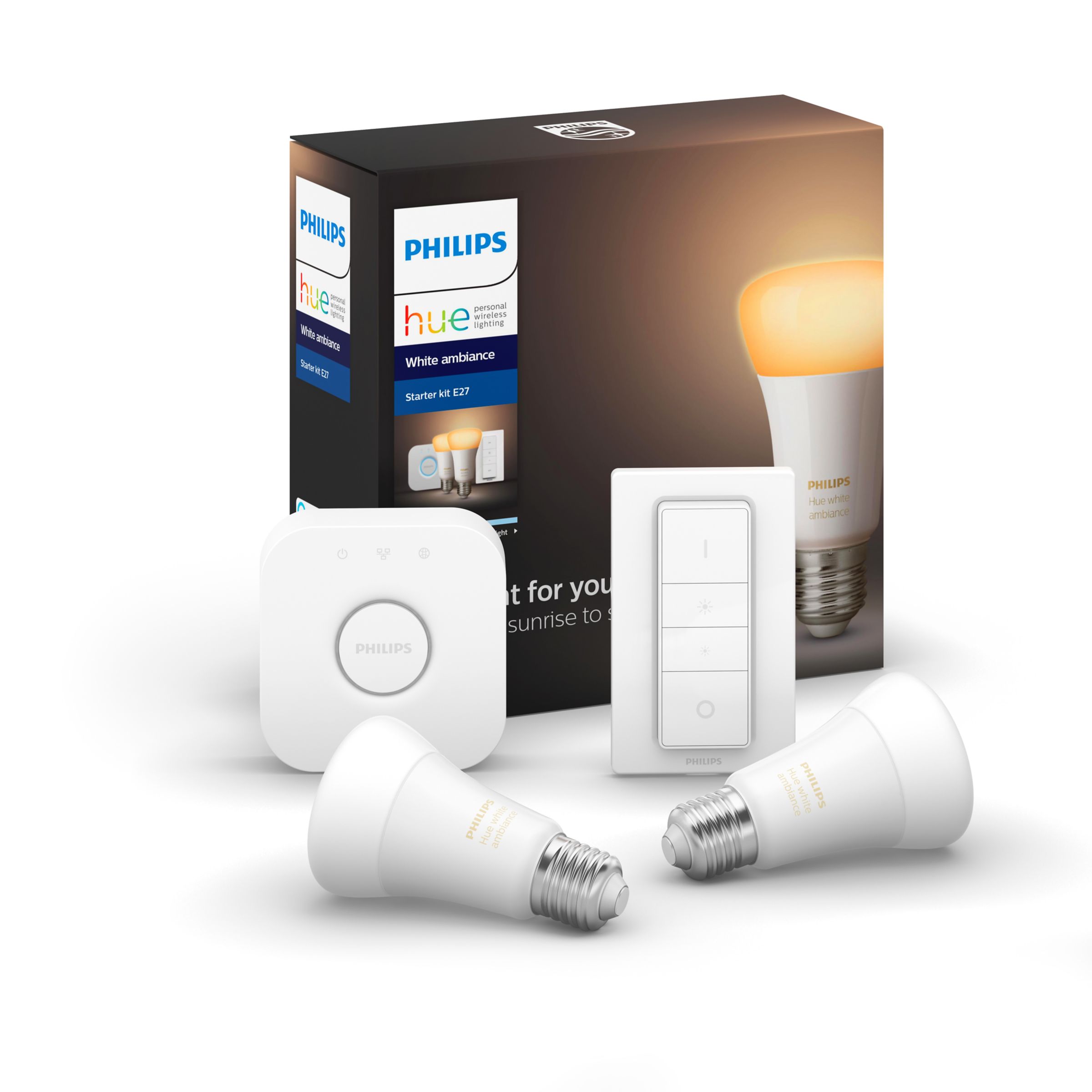 Packe Dein Hue White Ambiance E27 Starter-Set aus und erfreue Dich an entspannenden und energiespendenden Lichtszenen oder erstelle direkt eigene Routinen. Es enthält die Hue Bridge, 2 smarte Lampen mit dem gesamten Weißlichtspektrum sowie einen Dimmschalter.
