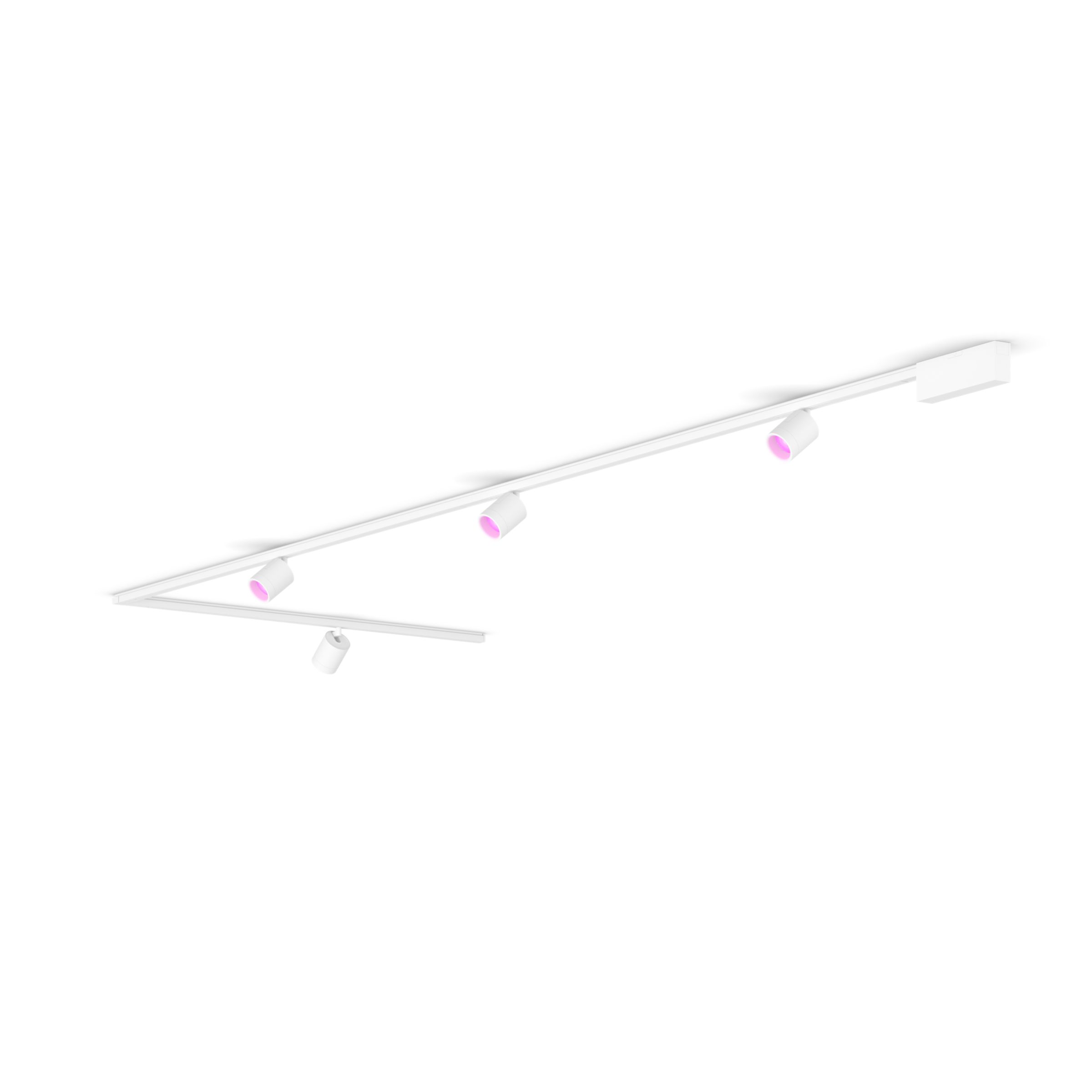 Dieses weiße Schienenbeleuchtungsset für die Decke enthält vier Zylinderspots, zwei 1,5 Meter lange Schienen, eine 1 Meter lange Schiene, ein am Ende einer Schiene befindliches Netzteil sowie Steckverbinder für eine nach rechts gehende L-Form.