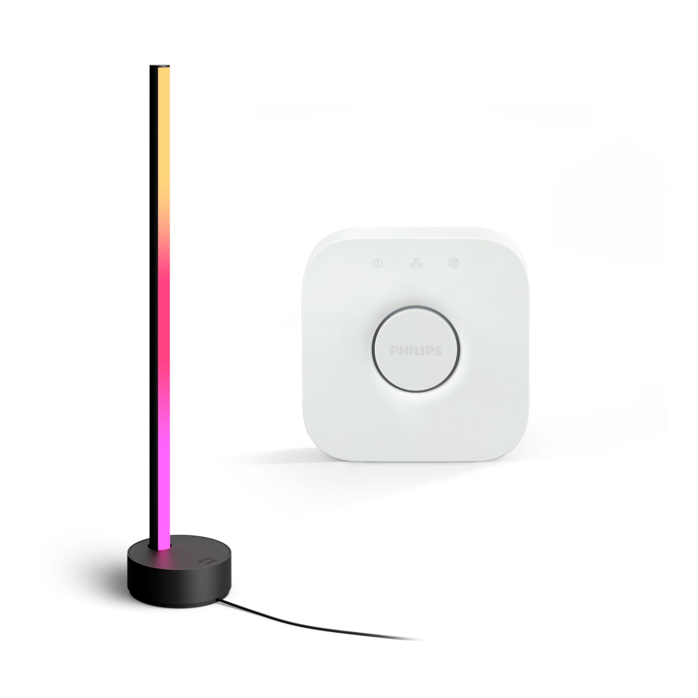 Die Philips Hue Gradient Signe Tischleuchte fügt sich dank ihres schlanken, stilvollen schwarzen Designs nahtlos in Deine Wohnkultur ein. Mit einer Zusammenstellung aus mehreren Farben erzeugt sie einen einzigartigen Farbverlauf an Deinen Wänden.