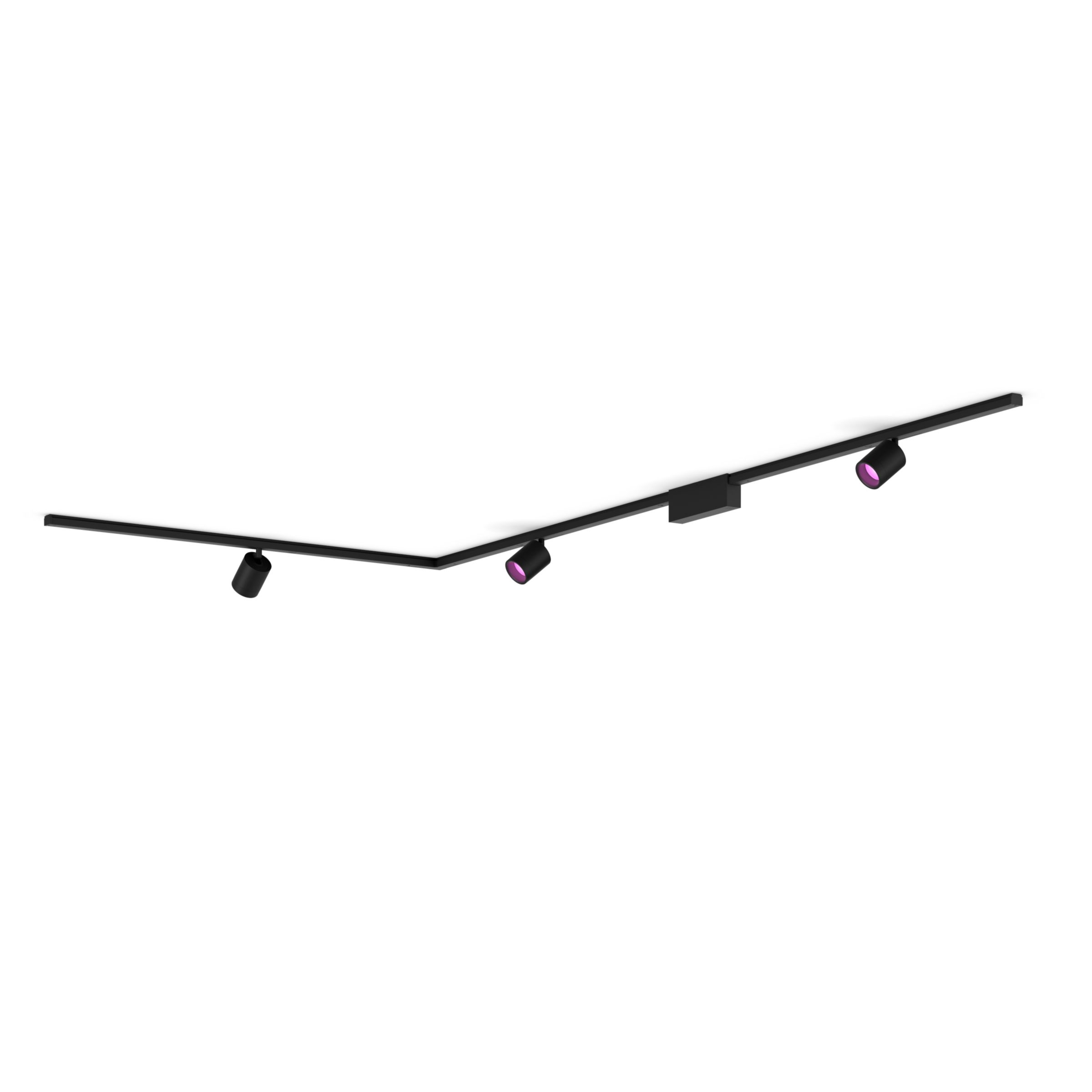 Dieses schwarze, smarte Schienenbeleuchtungsset für die Decke enthält drei Zylinderspots, drei 1 Meter lange Schienen, ein zwischen den beiden Schienen befindliches Netzteil sowie Steckverbinder für eine nach links gehende L-Form.