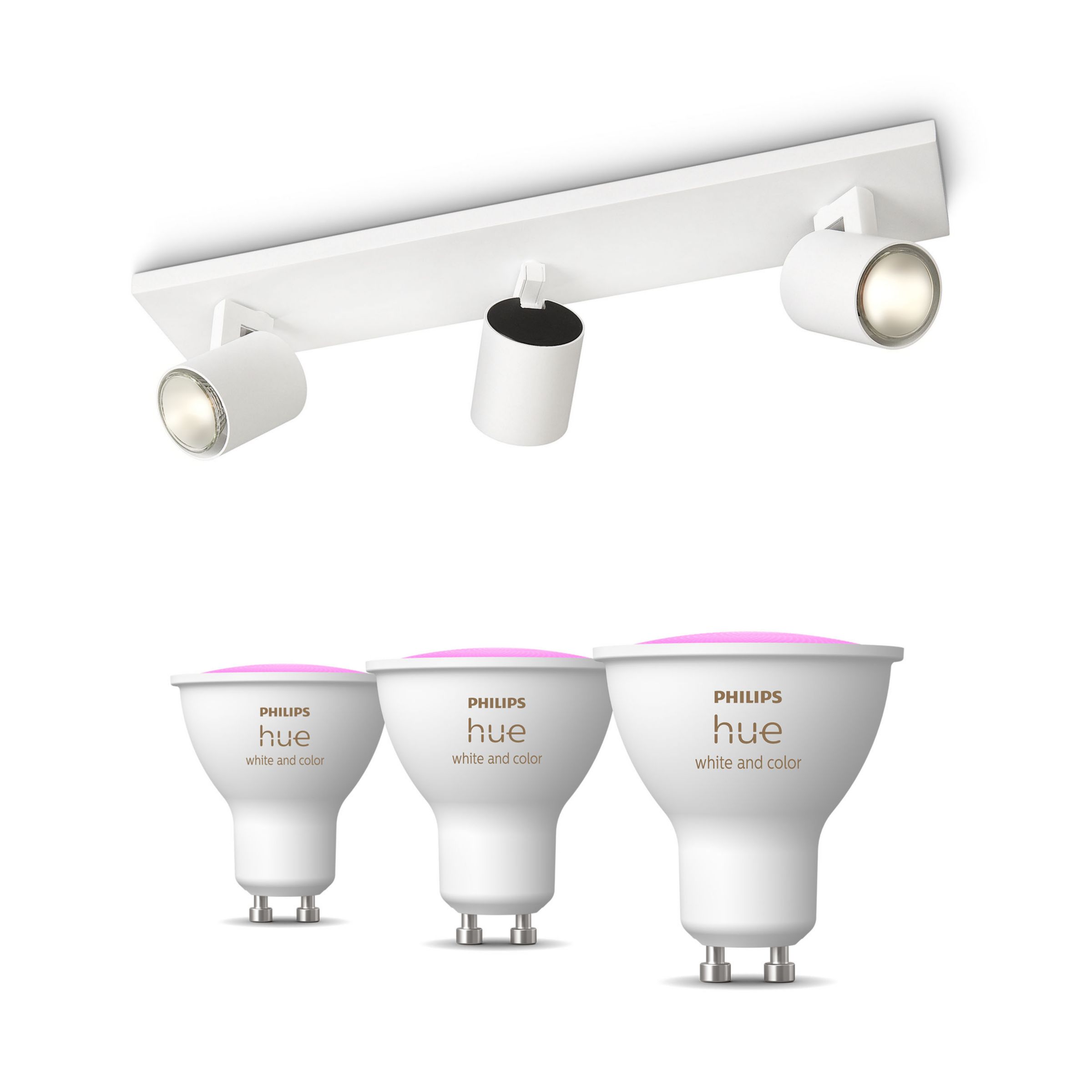 Beleuchte deine Innenräume mit dem Philips Runner Spot 3er-Pack in weiss mit farbfähigen Hue GU10-Lampen. Modern und lebendig.
