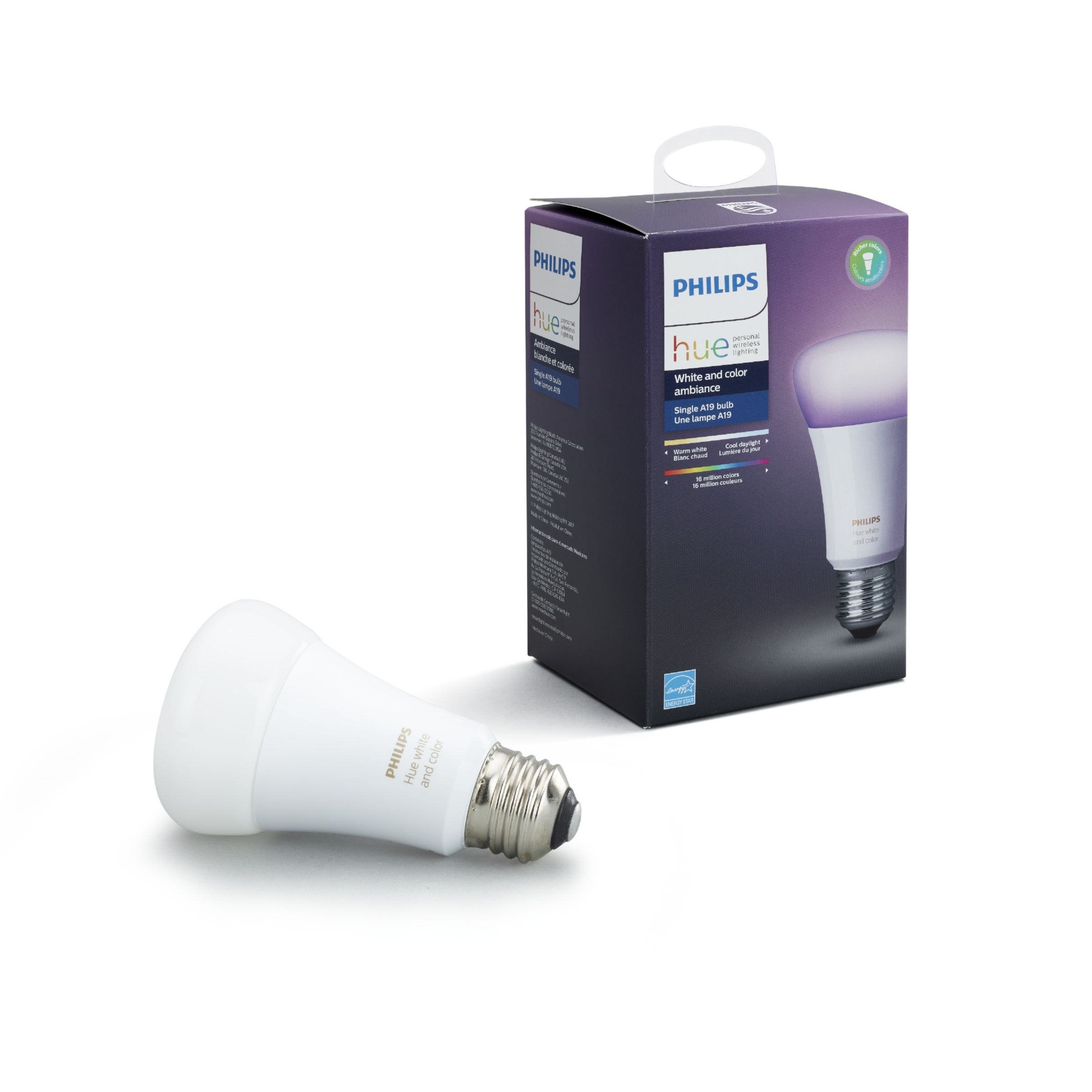 Add color to any room with a single smart bulb, which offers ranges of warm to cool white light as well as 16 million colors. Connect to the Hue Bridge to unlock the full smart lighting control and features. As bright as a 60 W bulb.