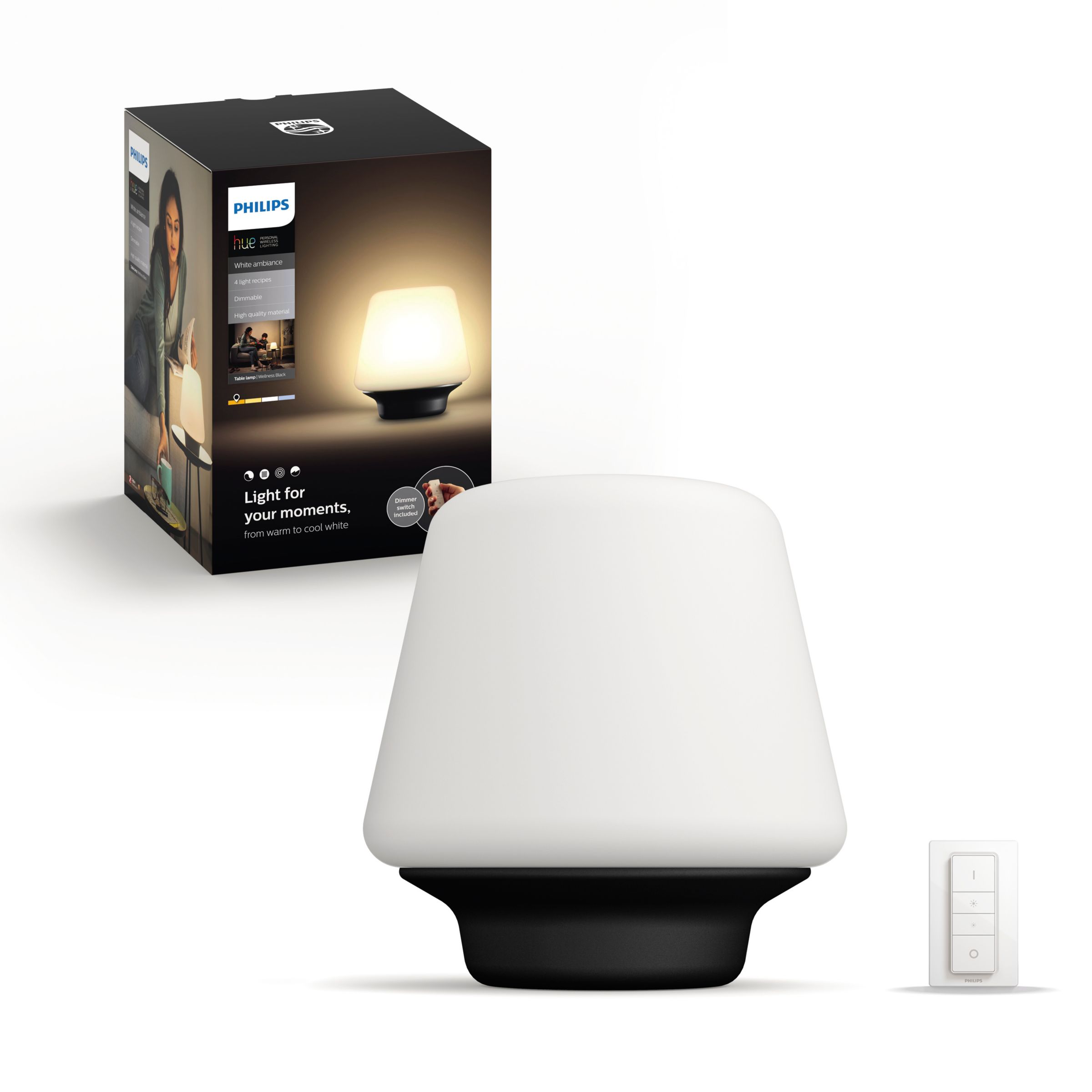 Include the Wellness Philips Hue white ambiance table lamp in your Philips Hue system and enjoy natural white light that helps you to wake up, energise, concentrate, read and relax. Enjoy the timeless design of this nice table lamp.