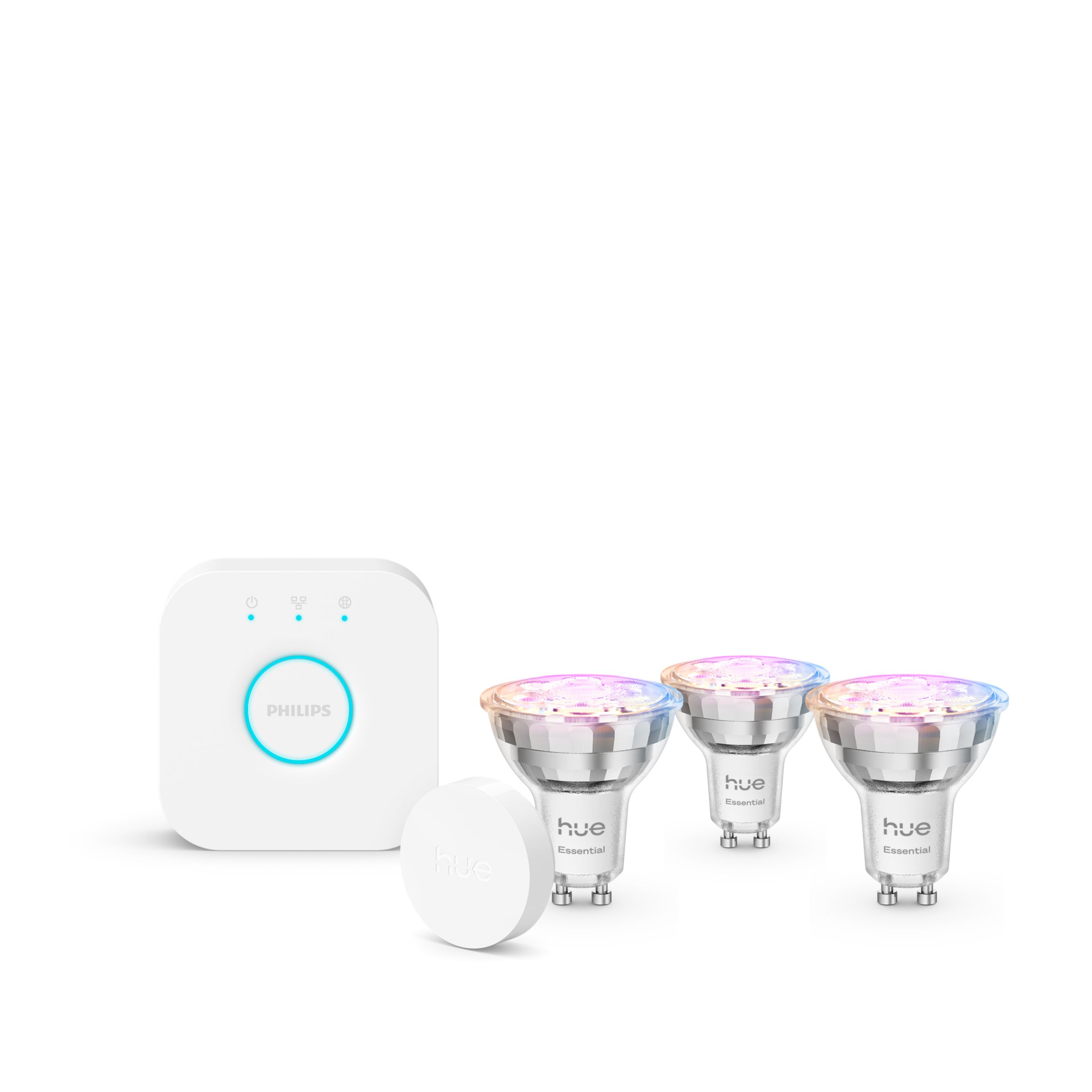 Step into the world of smart lighting with this Philips Hue Essential starter kit, featuring three full-colour and tunable white bulbs that you can easily adjust from warm and cosy to cool white light. Set the perfect mood with smooth dimming, millions of colours and a library of light scenes designed by our experts – or create your own! Connect to the included Hue Bridge to take advantage of the endless list of features. Control using your voice, the app or any smart accessory.