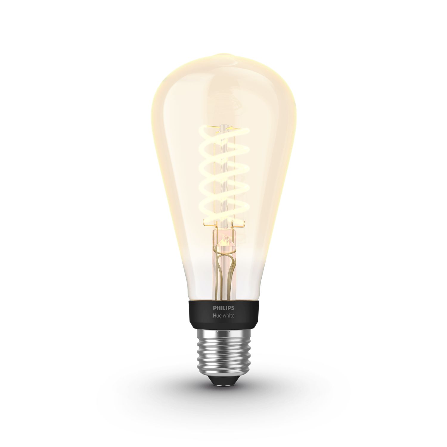 The larger version of the elongated Edison-style filament bulb, this ST72 bulb features Bluetooth capability, a coiled filament and elegant amber coating for a modern take on a vintage design. Use with Bluetooth or pair with a Hue Bridge to unlock more smart lighting features.