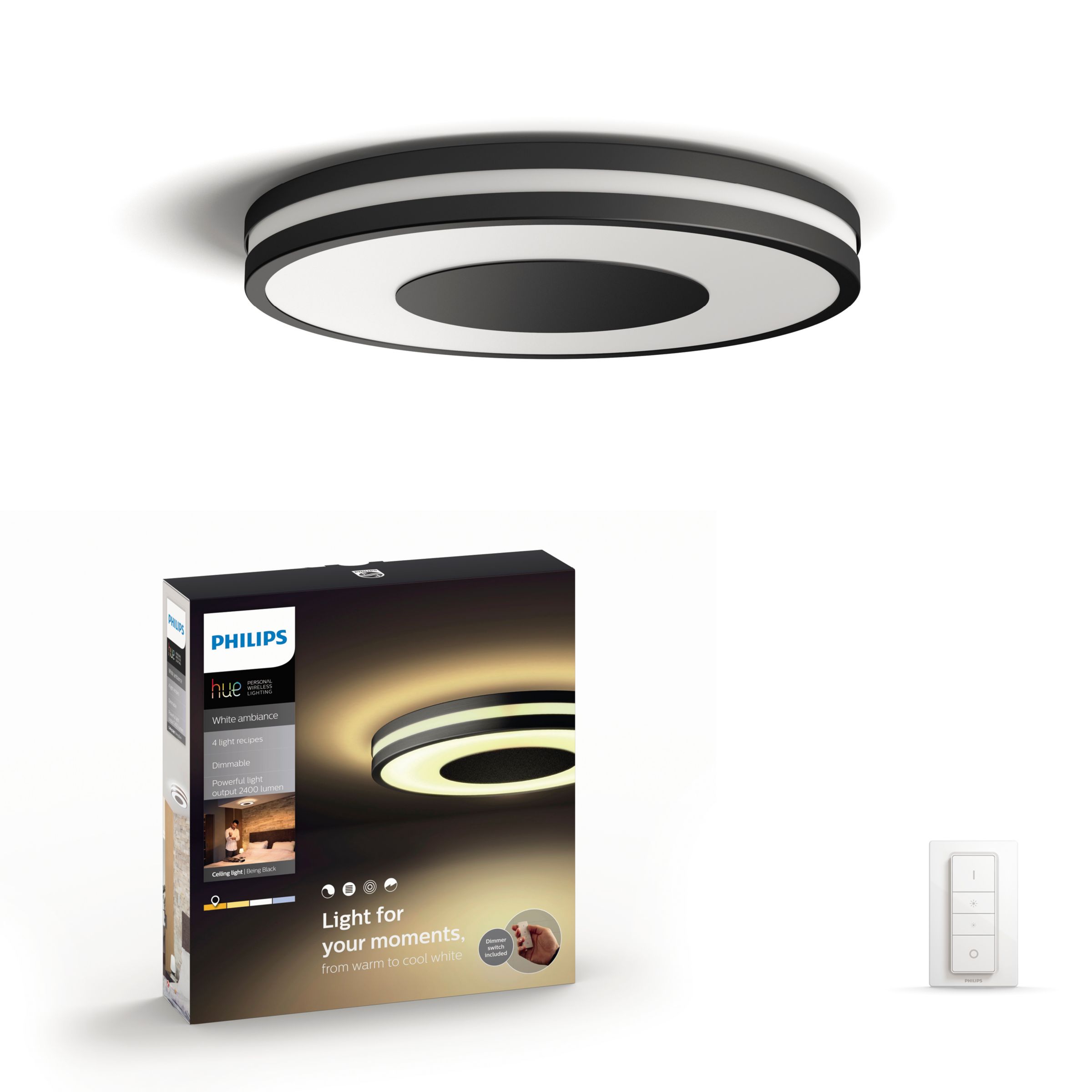 Include the Being Philips Hue white ambiance ceiling in your Philips Hue system and enjoy natural white light that helps you to wake up, energize, concentrate, read and relax. Enjoy this elegant design and nice light glow on your ceiling