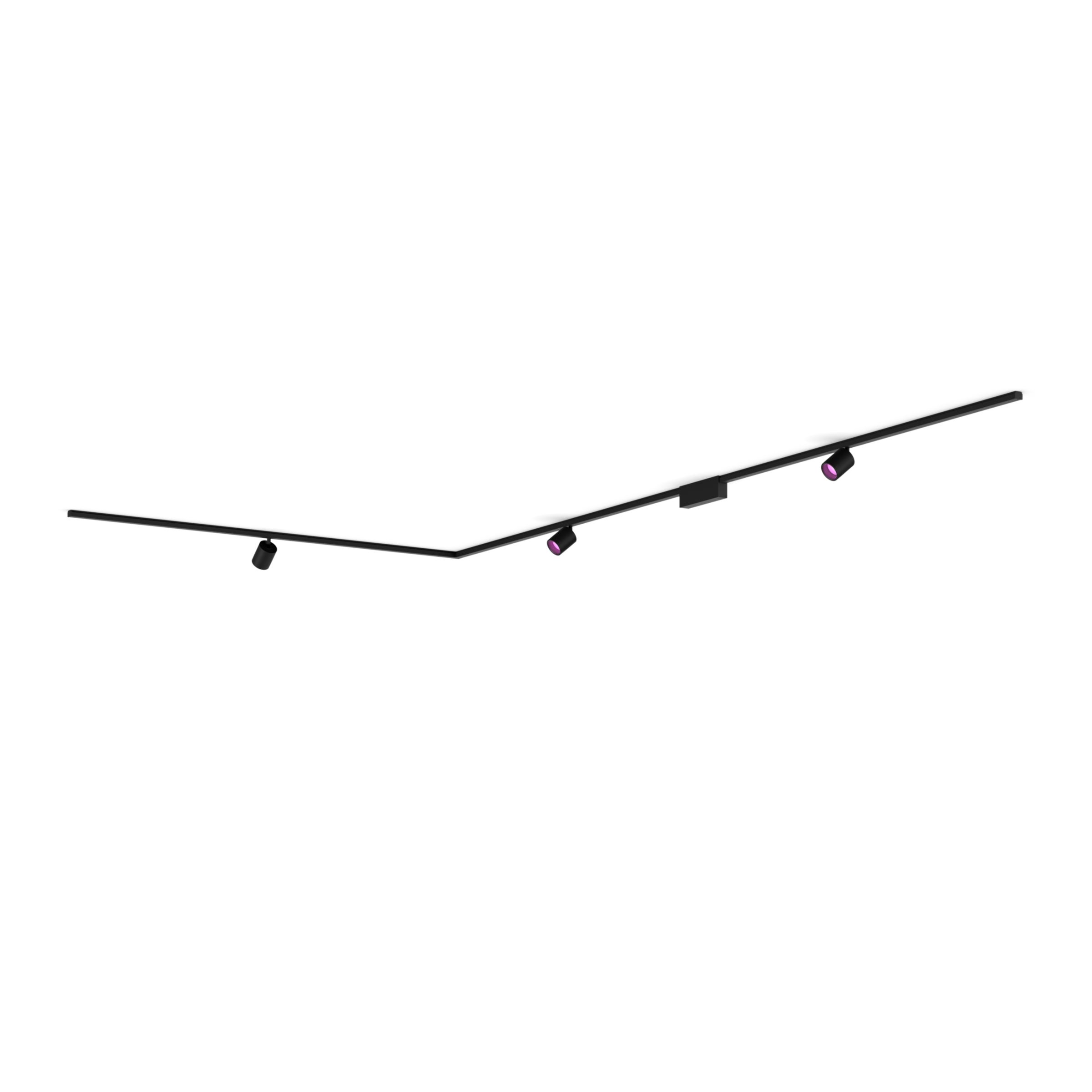 This ceiling smart track lighting kit in black includes three cylinder spotlights, three 59.1 inch rails, a PSU that sits in between two rails, and connectors to create an L shape that turns to the left.