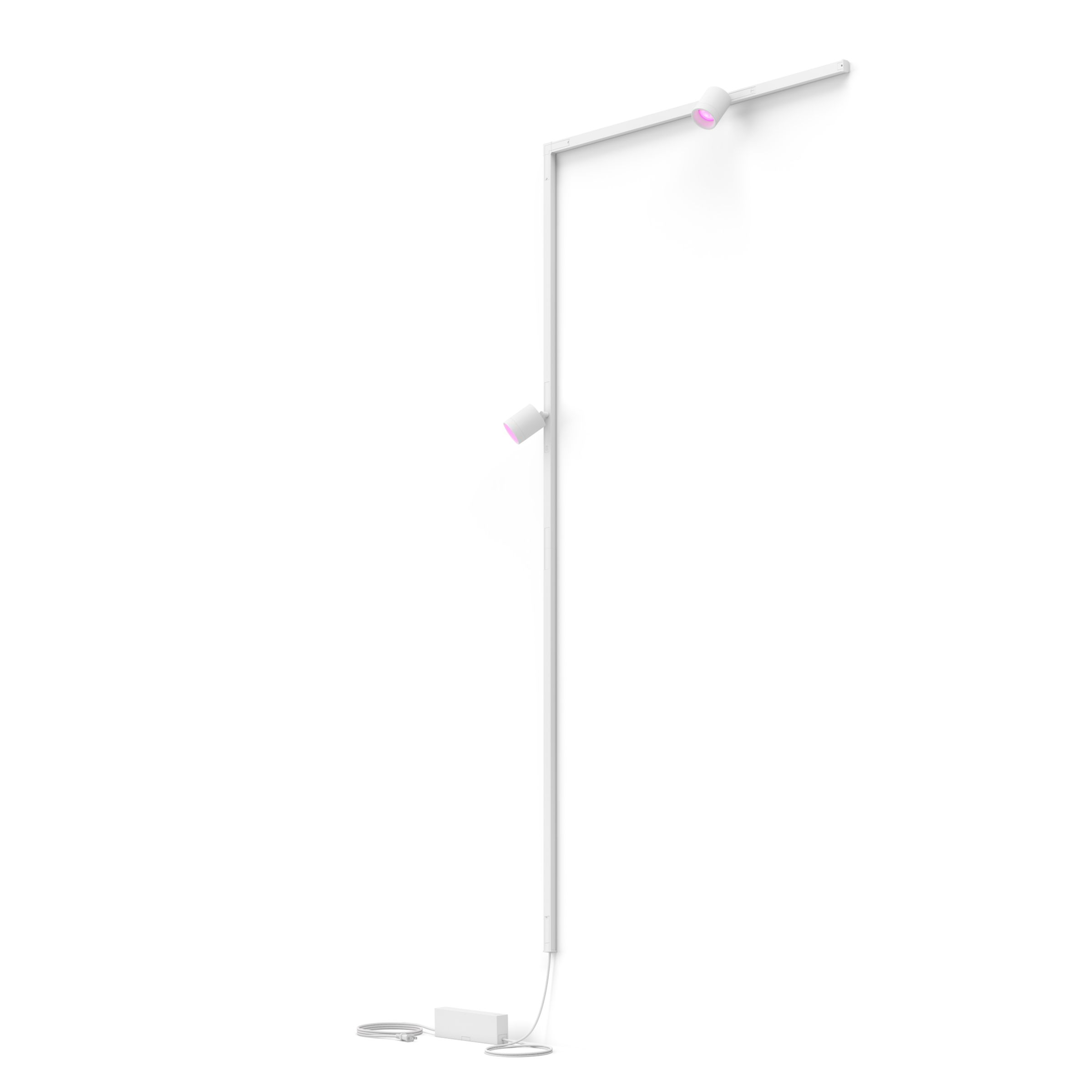 This wall track lighting kit in white includes two cylinder spotlights, three 39.4 inch rails, a PSU with a plug for a wall outlet, and connectors to create an L shape that turns to the right.