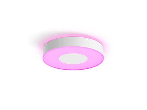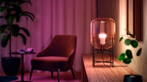 A couple relax in a living room illuminated with purple and pink smart light from Philips Hue smart lamps.