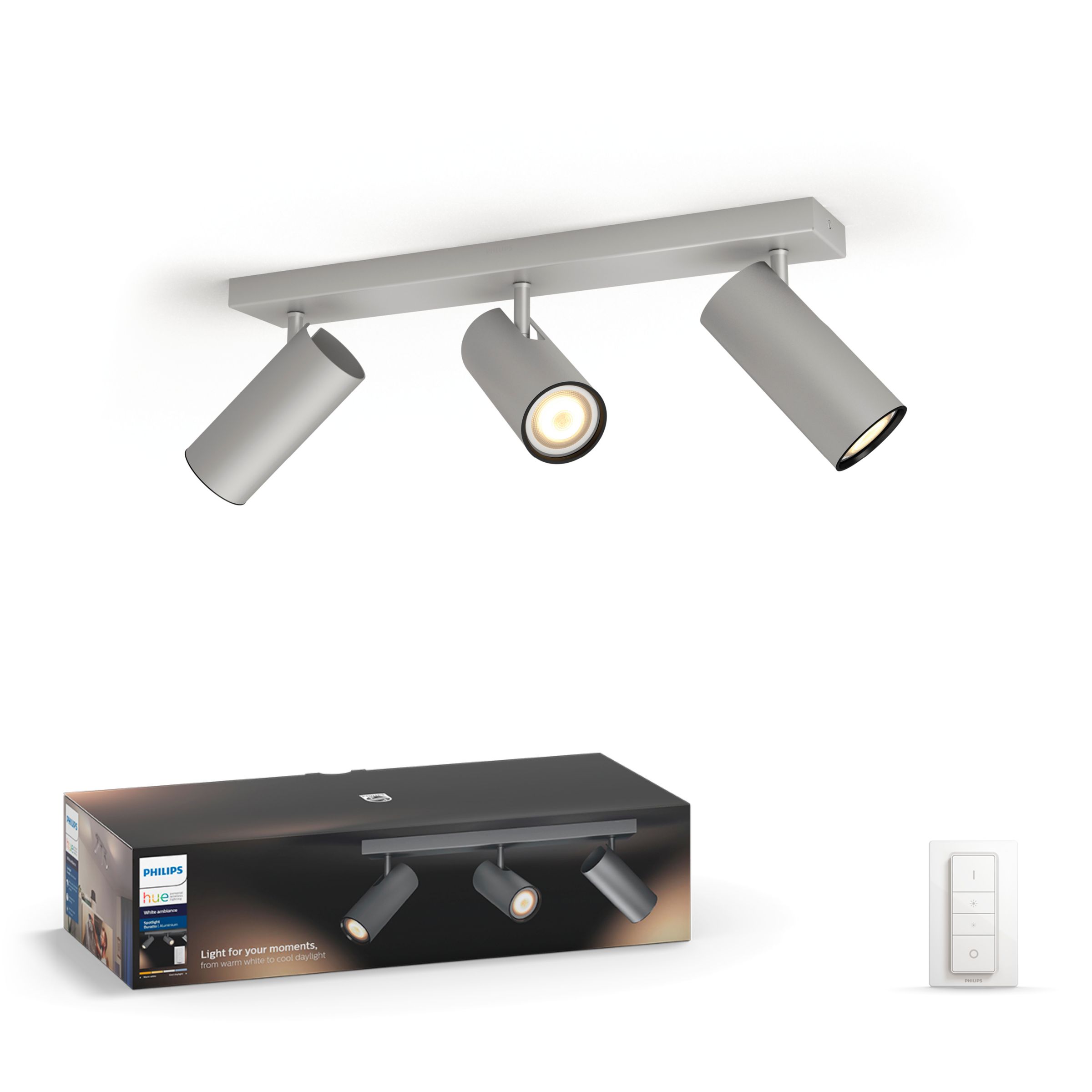 Los focos direccionales Philips Hue white ambiance Buratto de luz blanca ambiental incorporan un regulador inalámbrico y una bombilla LED GU10 de luz blanca ambiental que te ayuda a leer, relajarte, concentrarte y llenarte de energía. Disfruta de una luz blanca natural que se ajusta a tu rutina.