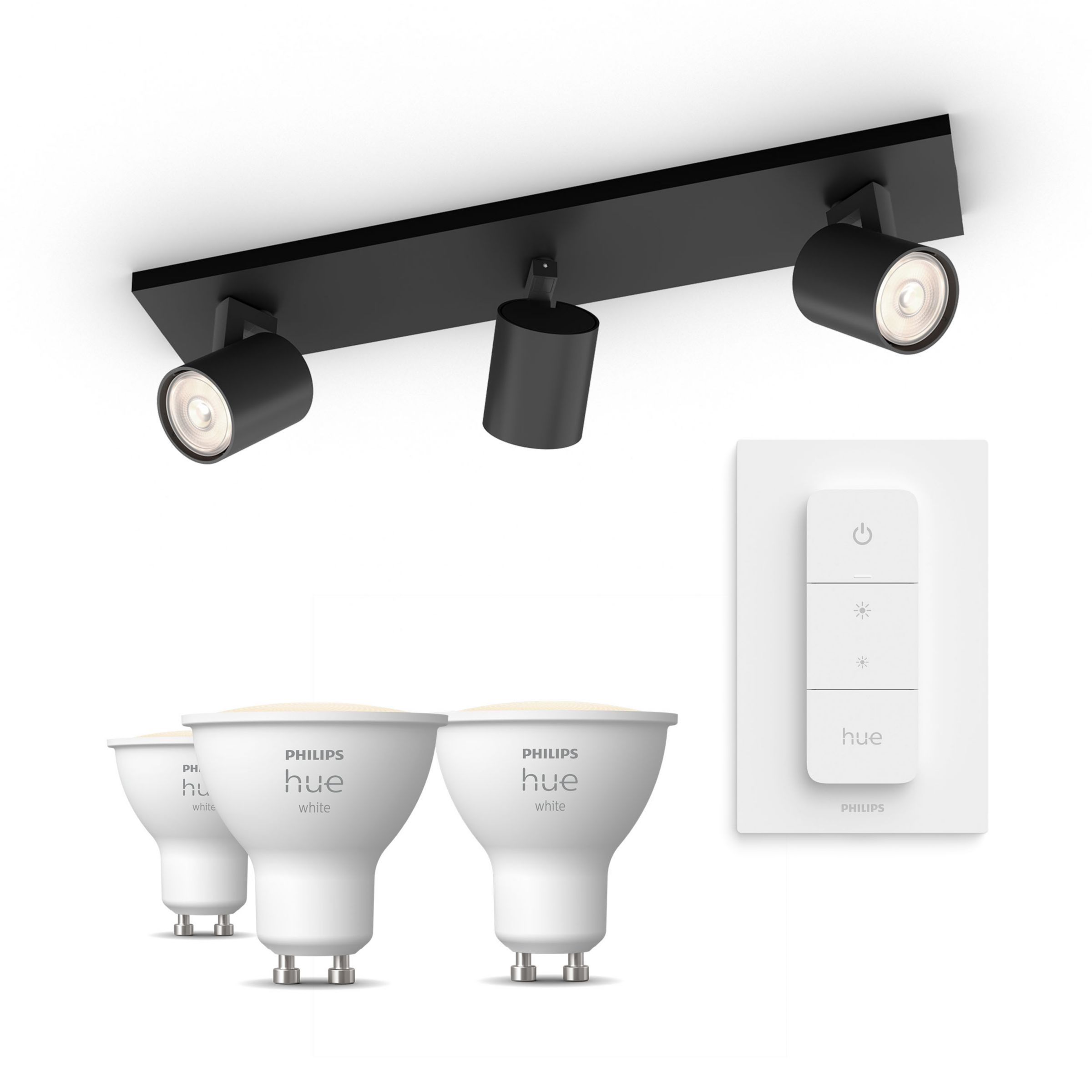 Luo täydellinen tunnelma mustalla kahden spotin Philips Runner valaisimella, Hue Dimmer switch -kytkimellä sekä Hue White GU10 -älylampuilla. Monipuolista ja tyylikästä valaistusta.