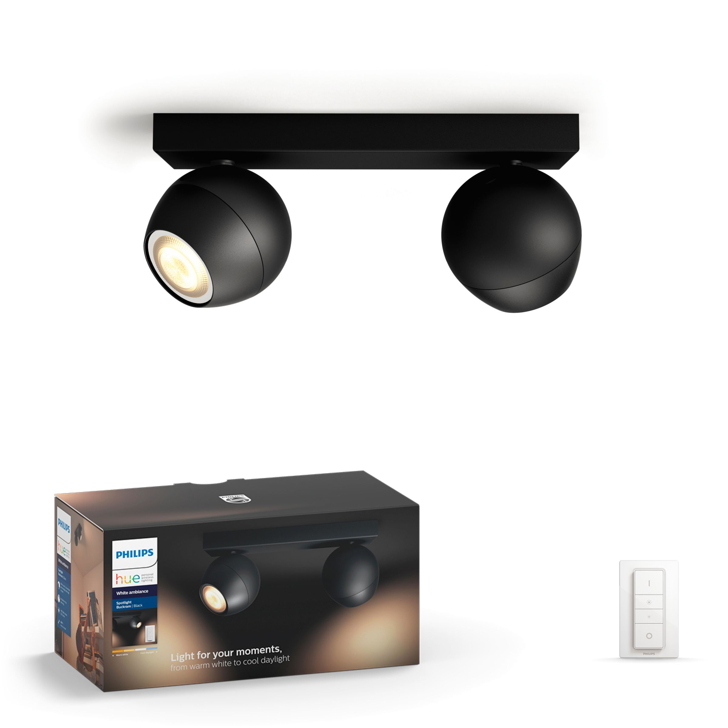 Les spots Philips Hue White Ambiance Buckram sont fournis avec un interrupteur avec variateur sans fil et une ampoule LED GU10 White Ambiance, pour vous aider à vous reposer, à lire, à vous concentrer ou à vous ressourcer. Profitez d'une lumière blanche naturelle qui s'adapte à vos gestes quotidiens.