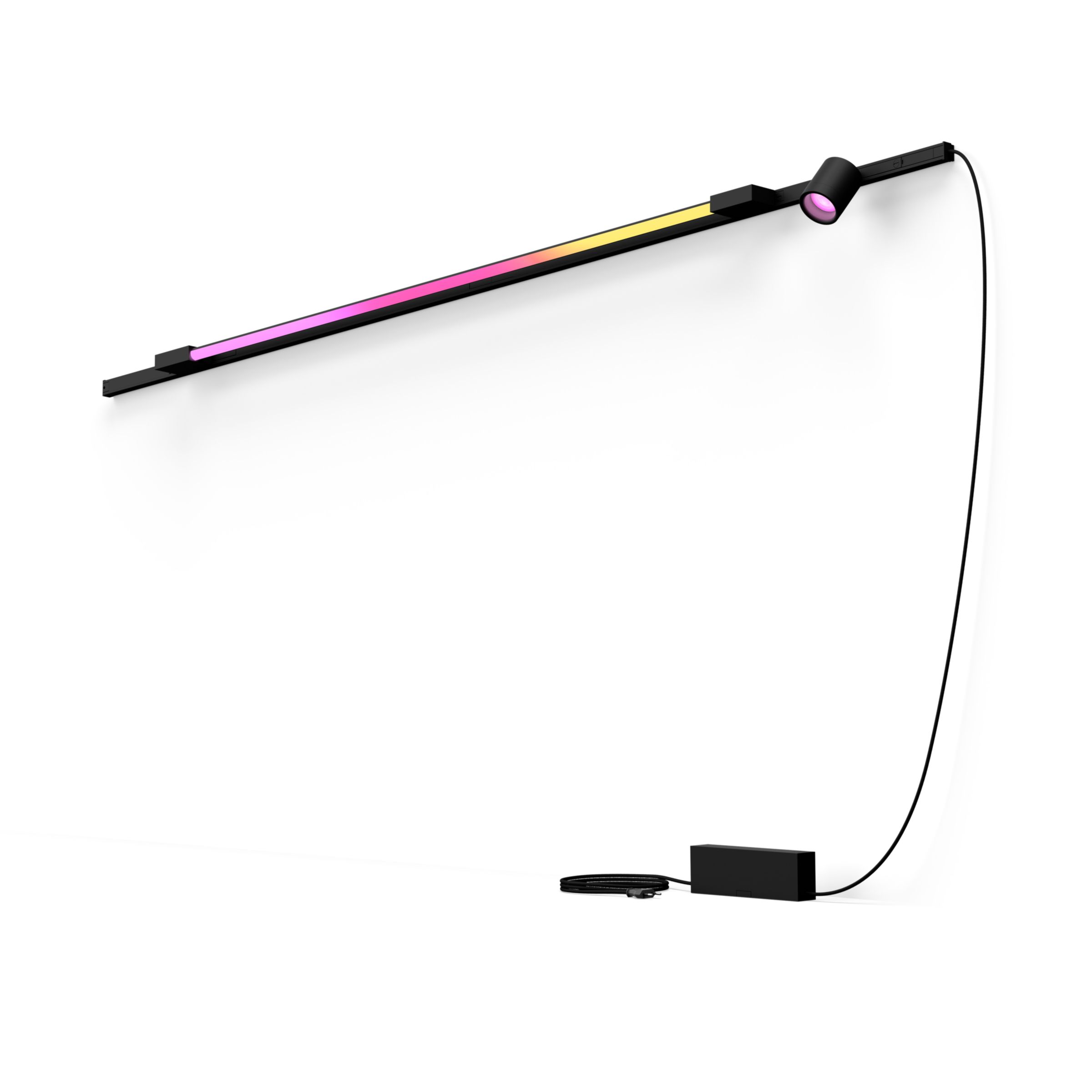 Ce kit d'éclairage sur rail mural, de couleur noire, comprend un tube lumineux gradient de grande taille, un spot cylindrique, deux rails de 1 mètre, un bloc d'alimentation doté d'une fiche pour prise murale et des connecteurs permettant de former une ligne droite.