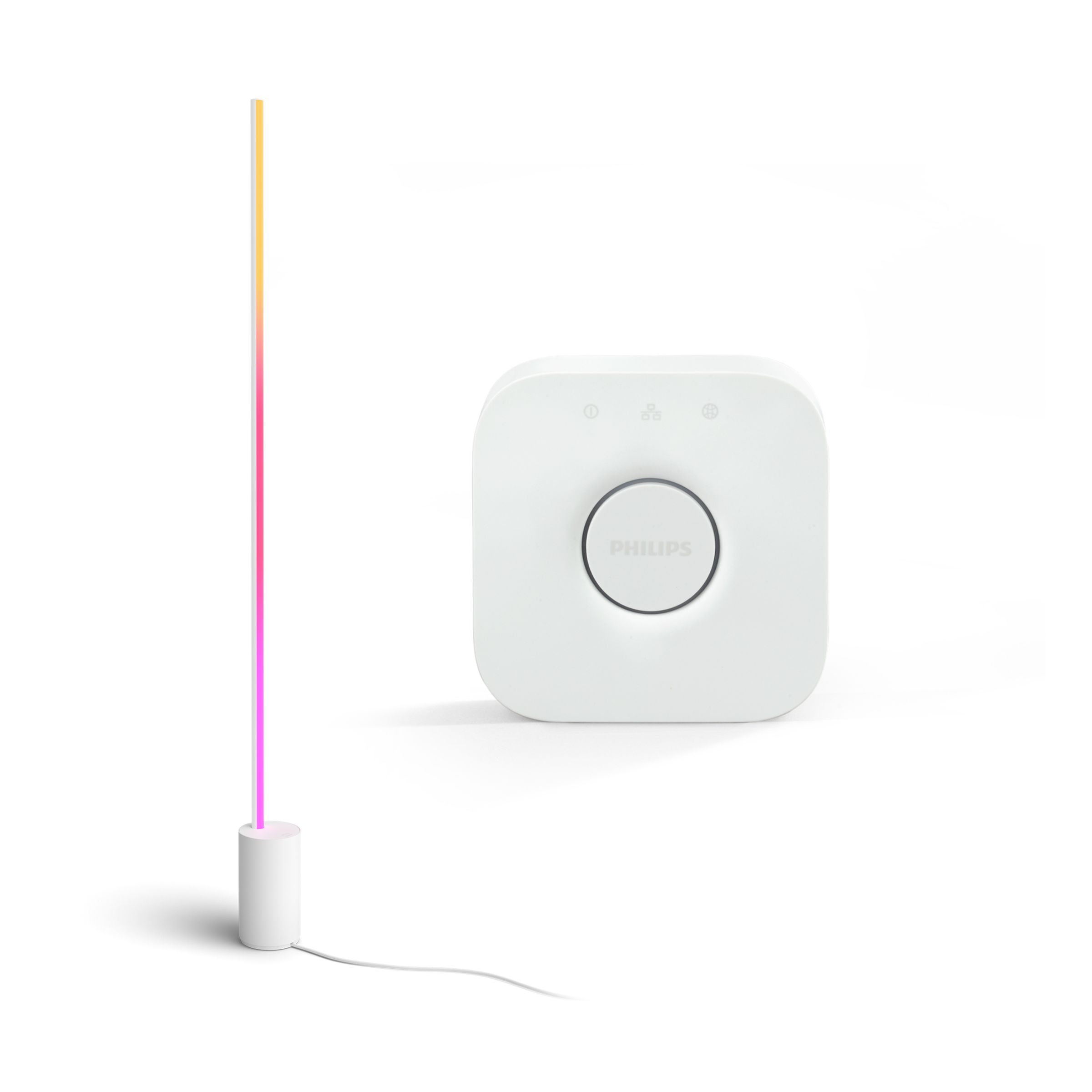 Crea immediatamente una meravigliosa atmosfera. La lampada da terra Signe gradient illumina le pareti con varie tonalità di colore, mentre Hue Bridge sblocca la serie completa di funzioni dell'illuminazione connessa.