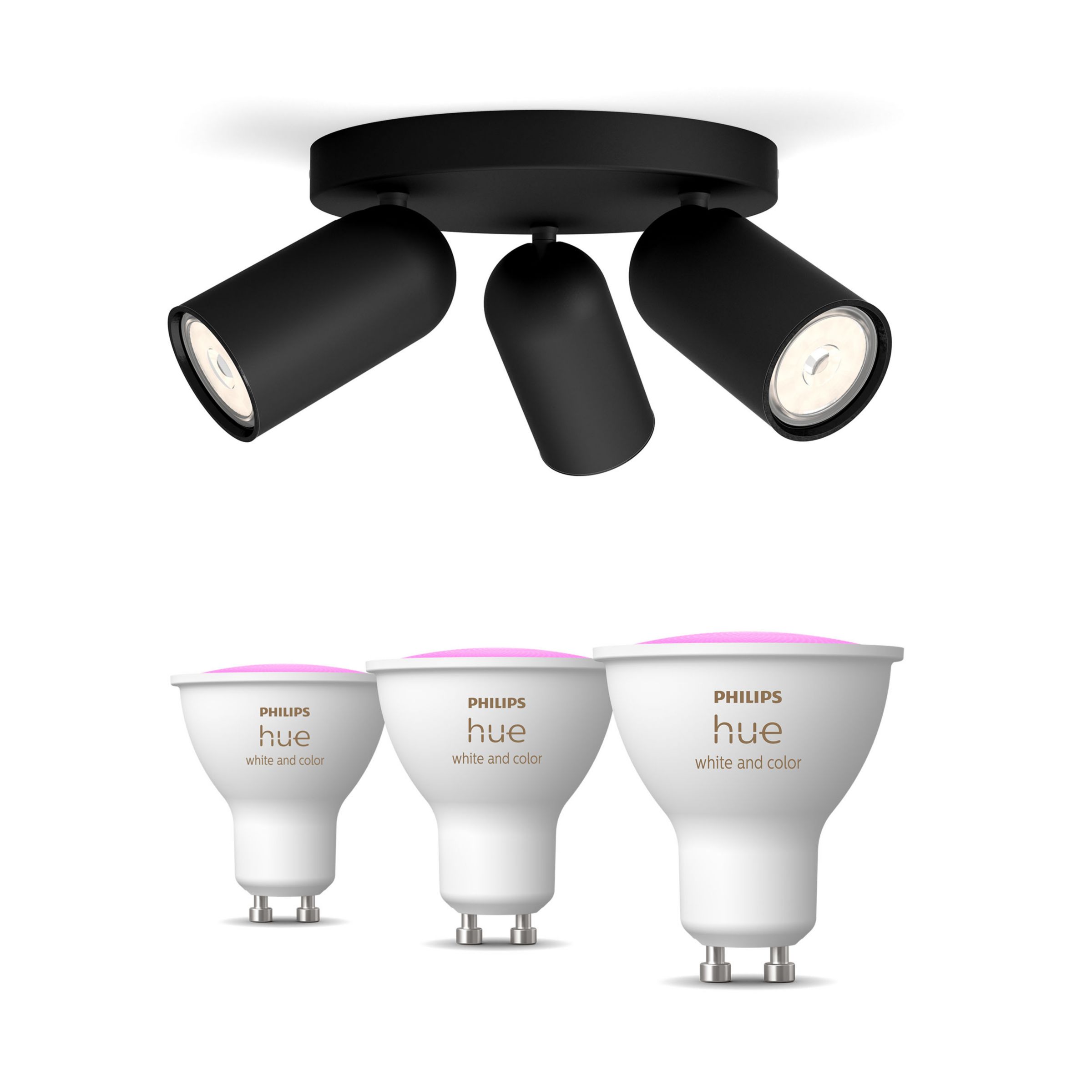 Illumina la tua casa con stile con la base per 3 faretti Philips Ponge nera e 3 lampadine Hue GU10 colorate.