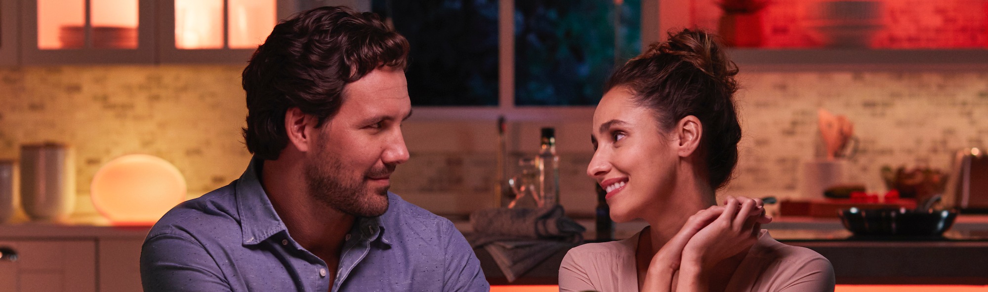 Je kleur is warmwit: geen diner is compleet zonder de warme gloed van romantische verlichting. Met het lichtrecept Ontspannen kun je de perfecte kleur en helderheid van het licht instellen voor een avond samen met je geliefde. Zorg voor een lamp boven je eettafel, zoals de Flourish hanglamp. Hiermee kun je een warme gloed creëren, zodra je de borden op tafel zet. Of gebruik de scène Candlelight romance, die zorgt voor een zachte, flikkerende kaarslichtgloed.