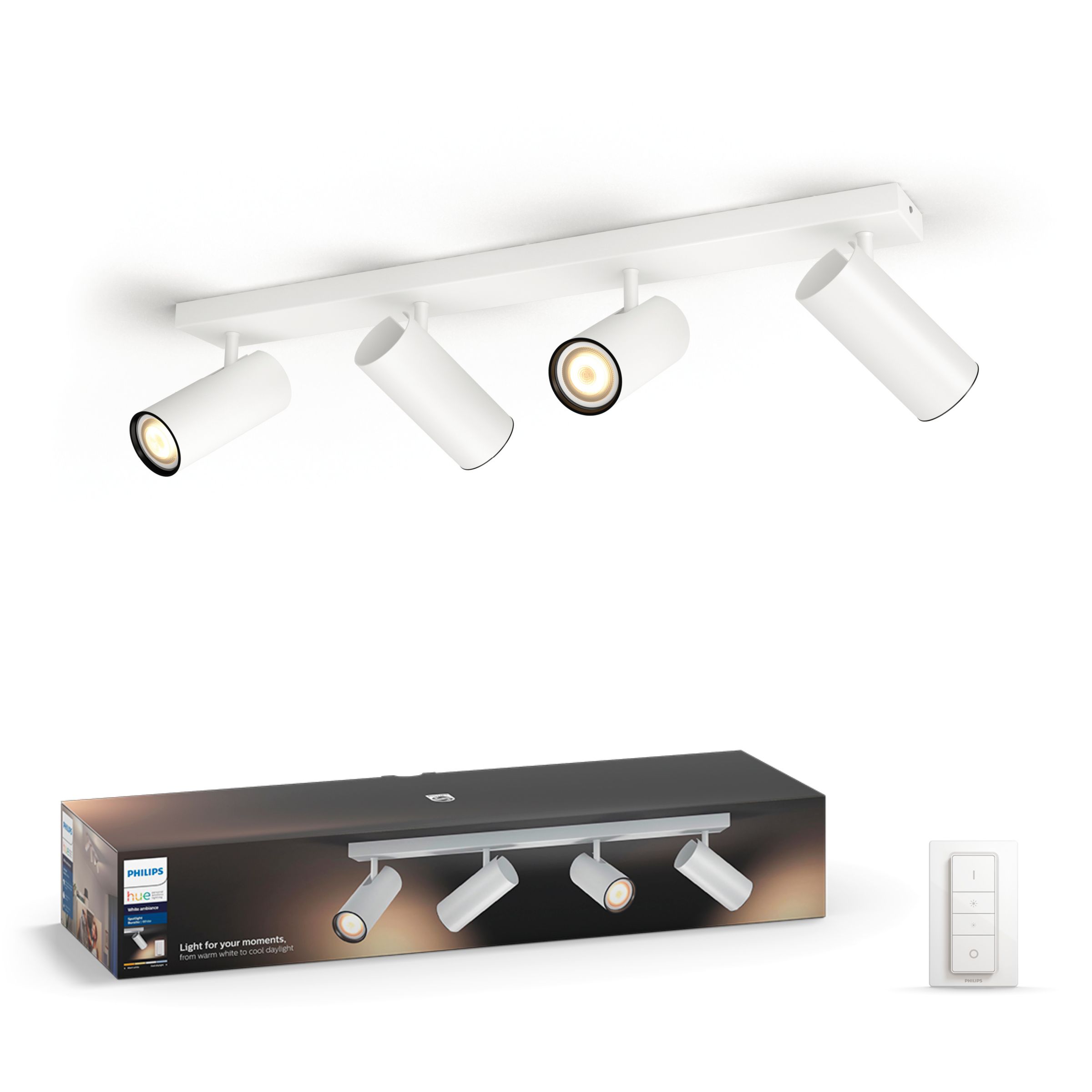 Philips Hue White Ambiance Buratto-spottene leveres med en trådløs dimmer og en White Ambiance GU10 LED-lyspære som hjelper deg med å slappe av, lese, konsentrere deg og få mer energi. Få et naturlig hvitt lys som tilpasser seg de daglige rutinene dine.