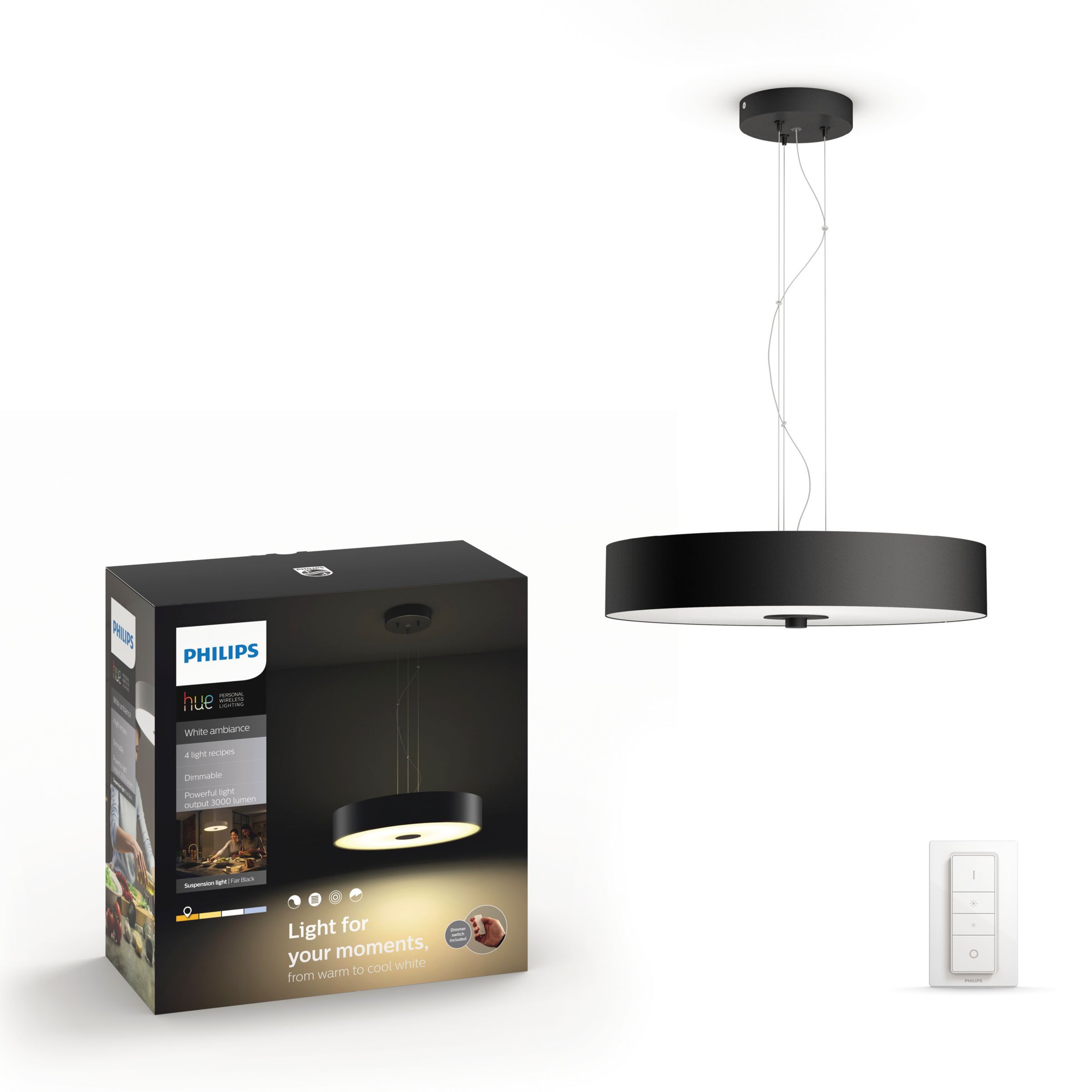 Lägg till pendellampan Fair Still Philips Hue för vit miljö i Philips Hue-systemet och njut av naturligt vitt ljus som hjälper dig att vakna, få energi, koncentrera dig, läsa och slappna av. Njut av den här elegant designade pendellampan som passar alla inomhusmiljöer