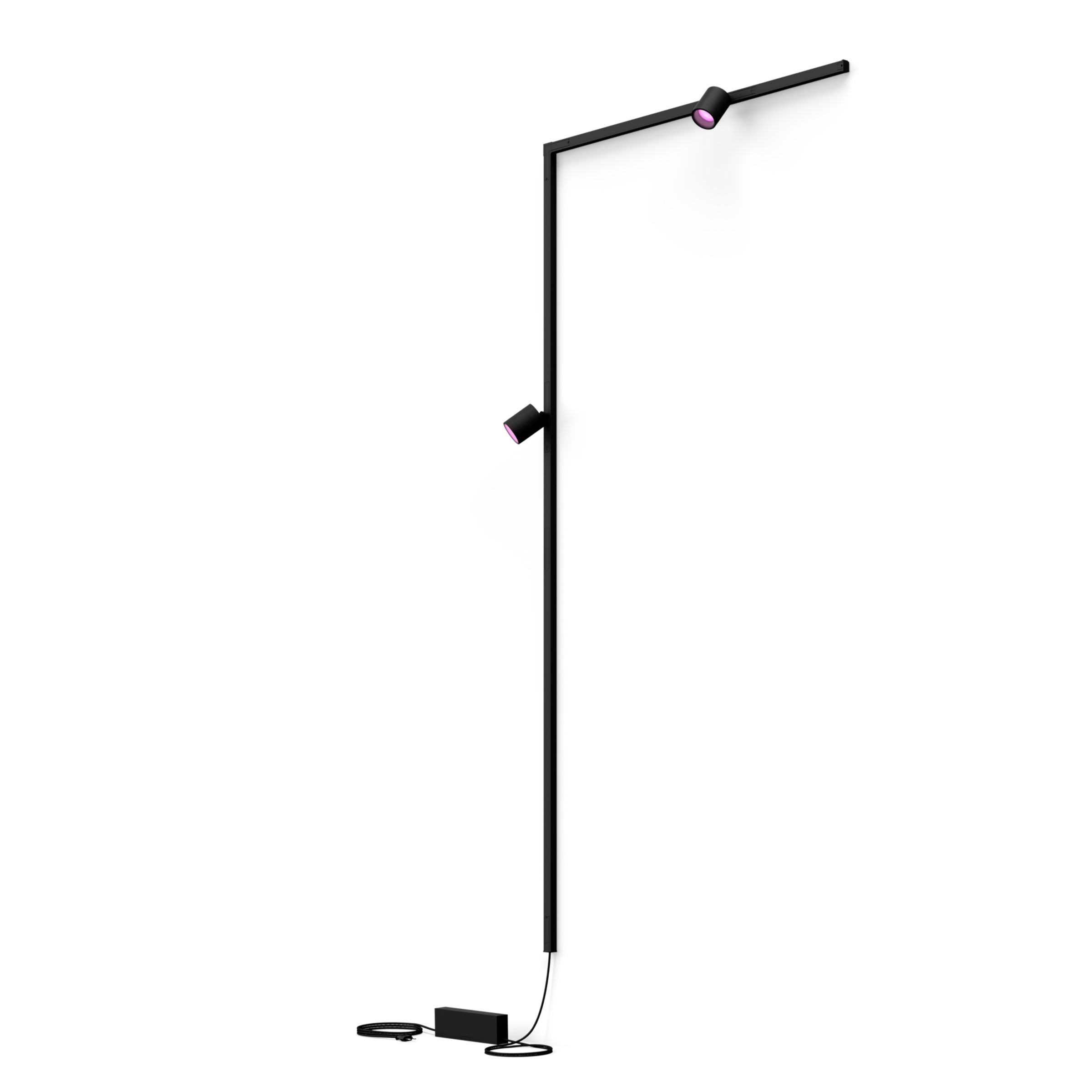Den här satsen med belysningsskenor för vägg i svart omfattar två cylinderspotlights, tre 1-metersskenor, en strömkällan med en kontakt för ett vägguttag och kontaktdon för att skapa en L-form som vrider sig åt höger.