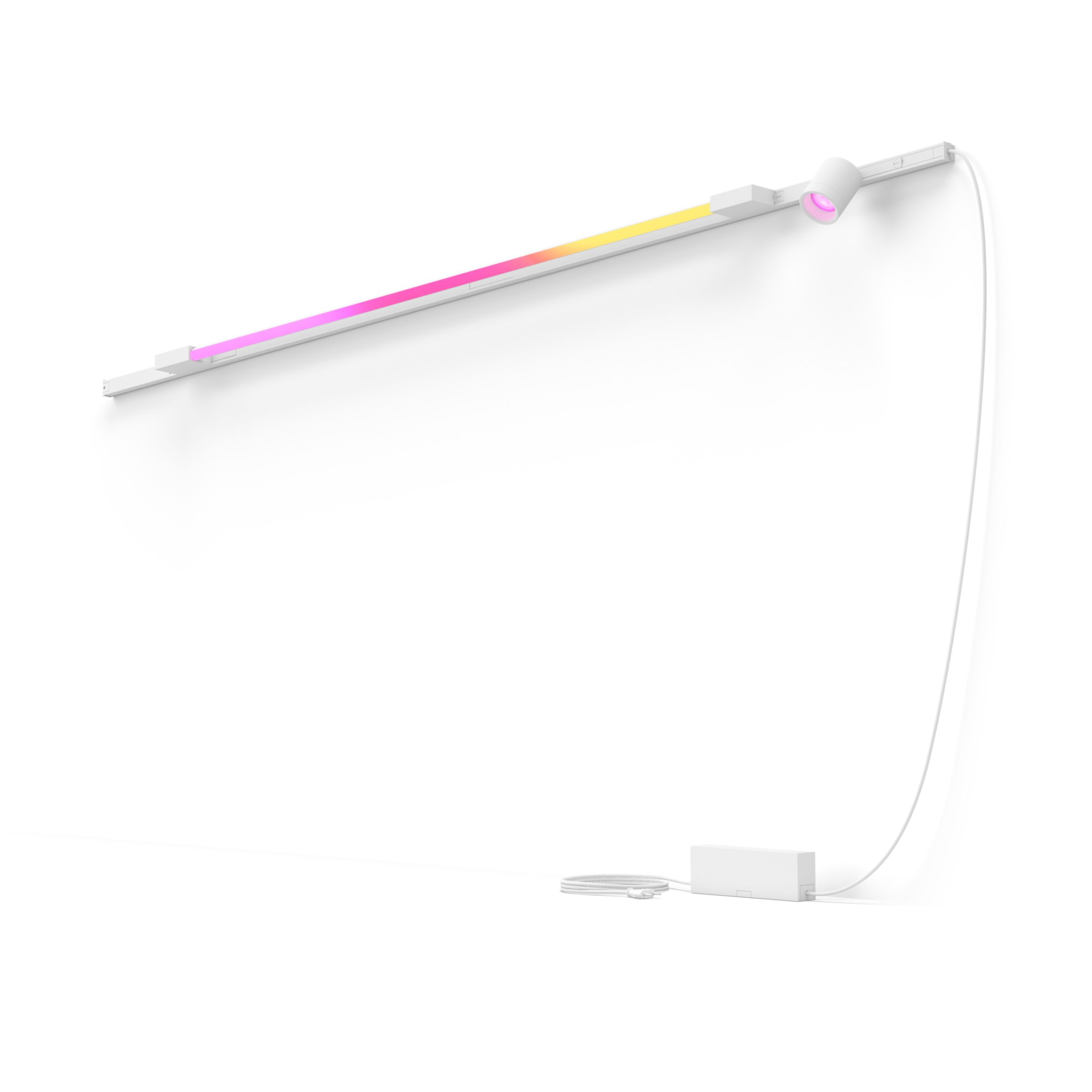 Den här satsen med belysningsskenor för vägg i vitt omfattar ett stort gradient-lysrör, en cylinderspotlight, två 1-metersskenor, en strömkällan med en kontakt för ett vägguttag och kontaktdon för att skapa en rak linje.