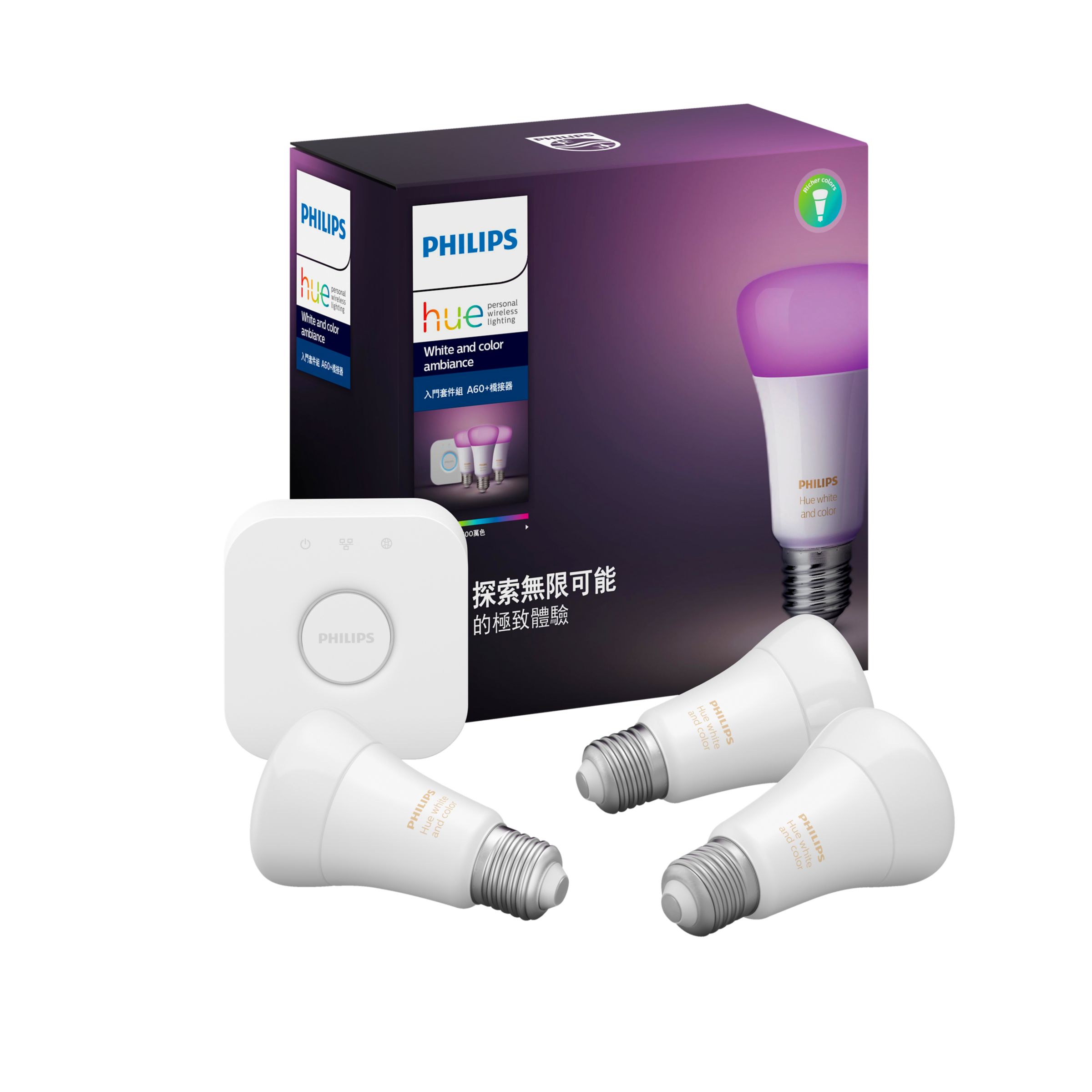 使用 Philips Hue 全彩情境系列 入門組為家增添情境色彩。此套組包含 3 顆智慧型全彩燈泡和一個 Hue 橋接器,您可以充分控制燈光、存取 Hue App 設定並享受豐富的照明體驗。